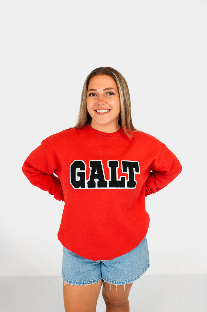 This sweatshirt features a classic red base with a textured black chenille "Galt" patch, finished with a silver glitter backing for the perfect amount of shine. Cozy, cool, and undeniably spirited—this one’s made for cheering loud and looking good while doing it.