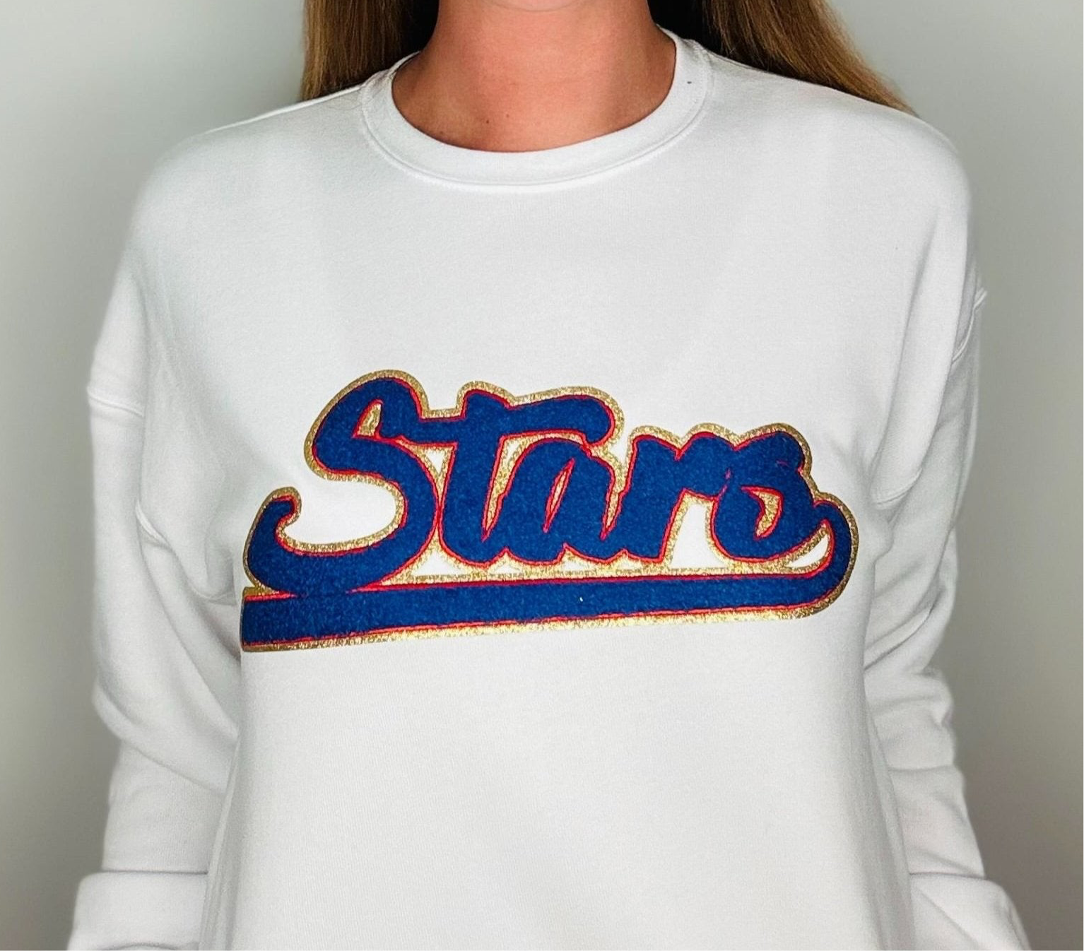 Cheer on your favorite Stars in this cozy fleece crewneck with a blue, chenille star patch on the front.