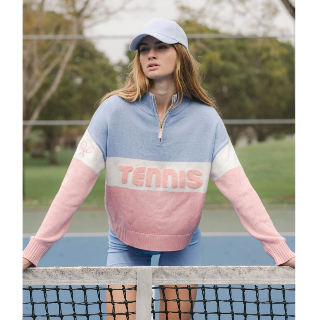 IT'S THE VARSITY SWEATER OF YOUR DREAMS! You'll love wearing this baby blue and pink tennis quarter zip whether you're watching the game or on the court for fun.
