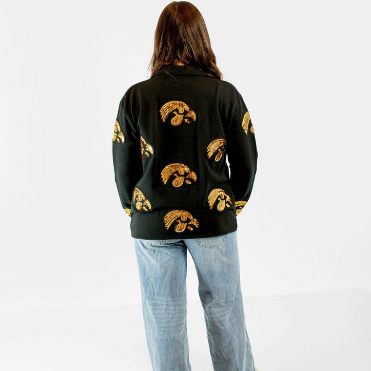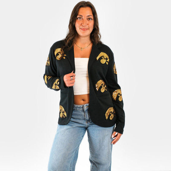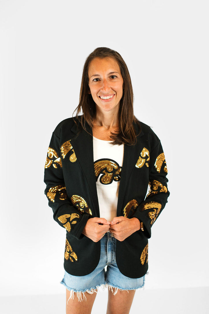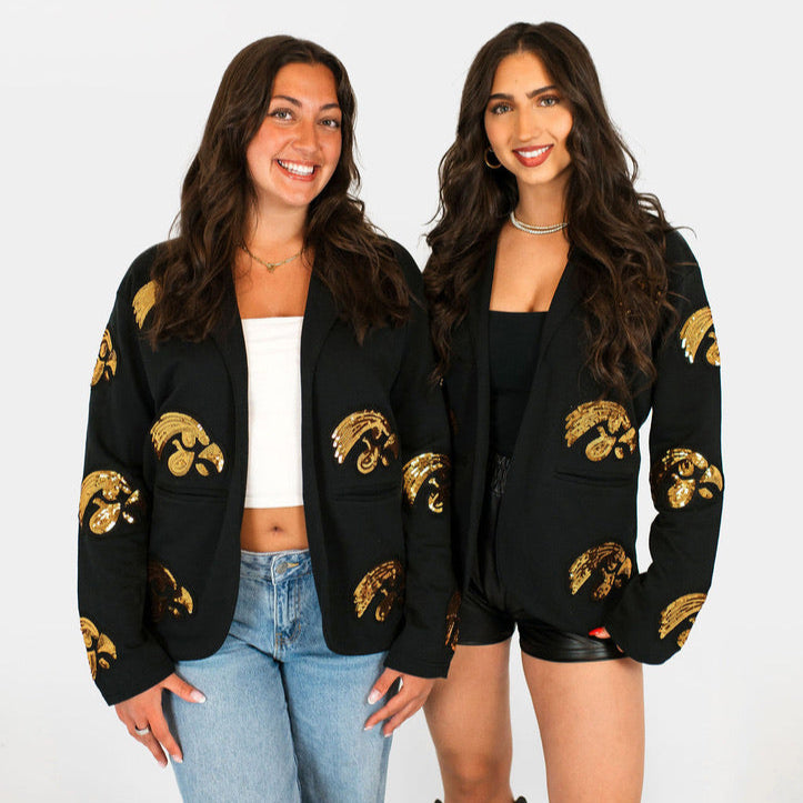 Make a statement on game day (or any day) with our Tigerhawk Sequin Blazer — where fierce Hawkeye pride meets high fashion. This sleek black blazer features bold sequin Tigerhawk patches covering the front and the back, bringing just the right amount of sparkle to your spirited style. Perfect for layering over a tee or dressing up your tailgate look.